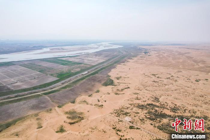 5月25日,航拍內蒙古阿拉善烏蘭布和生態教導示范基地范圍內的烏蘭布和戈壁包養與黃河濕地接壤處。(無人機照片)中新社記者 張祥毅 攝