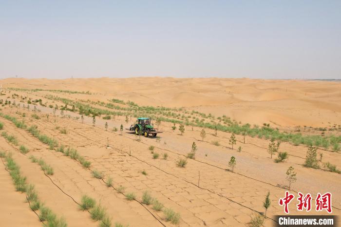 5月25日,在內蒙古阿拉善烏蘭布和生態教導示范基地,任務職員駕駛農用機穿行基地。(無人機照片)中新社記者 張祥毅 攝