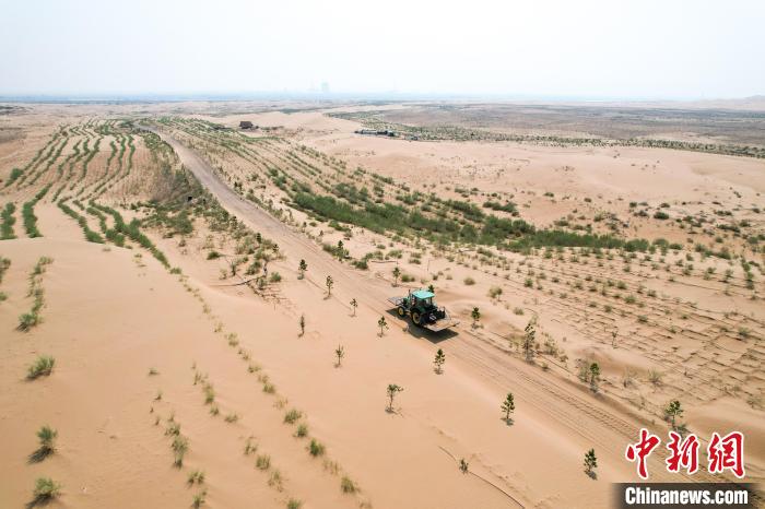 5月25日,在內蒙古阿拉善烏蘭布和生態教導示范基地,任務職員駕駛農用機穿包養網包養行基地。(無人機照片)中新社記者 張祥毅 攝