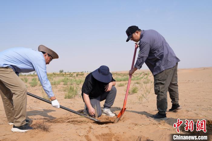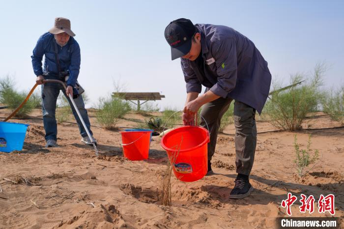 5月25日,在內蒙古阿拉善烏蘭布和生態教導示范基地,觀賞者體驗戈壁植樹。中新社記者 張祥毅 攝
